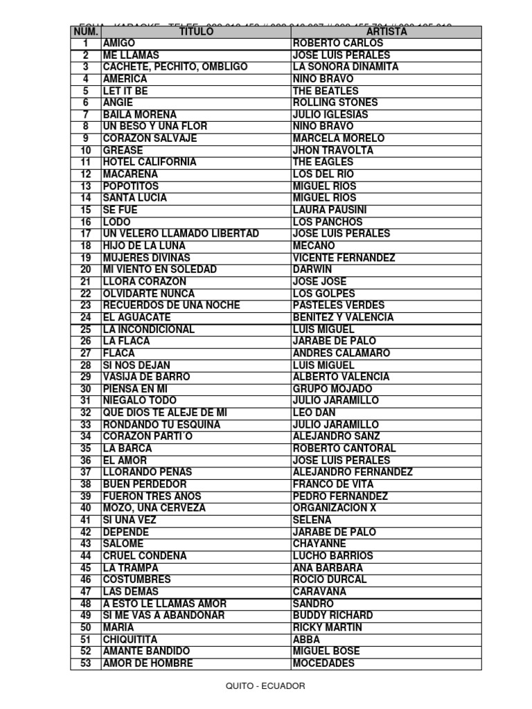 Listado De Canciones Xls Cantantes Musica Latinoamericana